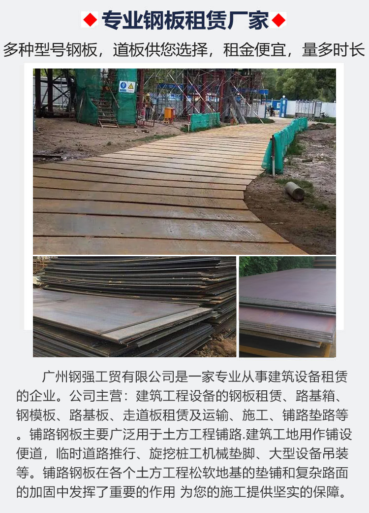 廣州鋼強工貿有限公司是一家專業從事建筑設備租賃的企業。公司主營:建筑工程設備的鋼板租賃、路基箱、鋼模板、路基板、走道板租賃及運輸、施工、鋪路墊路等。鋪路鋼板主要廣泛用于土方工程鋪路.建筑工地用作鋪設便道,臨時道路推行、旋挖樁工機械墊腳、大型設備吊裝等。鋪路鋼板在各個土方工程松軟地基的墊鋪和復雜路面的加固中發揮了重要的作用 為您的施工提供堅實的保障鋼板租賃是一種可以十分有效節約資金的方式,在市場上通過租賃鋼板完成工程的施工企業越來越多。這種方式受到了眾多企業的歡迎,可以看出鋼板租賃的市場前景一片光明。鋼板租賃只需要付出鋼板的租賃費用就可以了,這對于資金緊缺的企業來講是很方便的,畢竟購買同樣數量的鋼板的價格是需要更多的資金的,如果一開始就在鋼板的問題上花費了大量的經費,在工程后期很有可能出現資金···